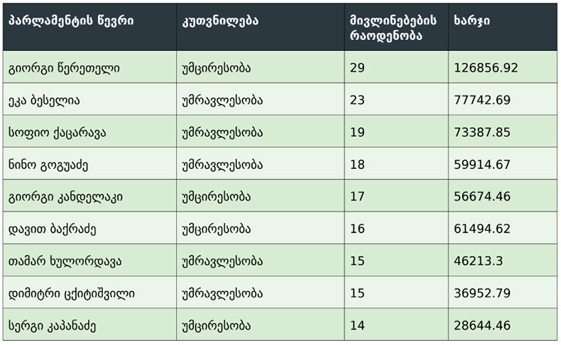 არასამთავრობო ორგანიზაცია “სერთაშორისო გამჭვირვალობა საქართველოს” მონაცემებით, ზოგჯერ პარლამენტის წევრის მივლინებების რაოდენობა და ხანგრძლივობა განპირობებული იყო მისი თანამდებობით ან შესაბამისი კომიტეტის საქმიანობის ძირითადი მიმართულებებით.