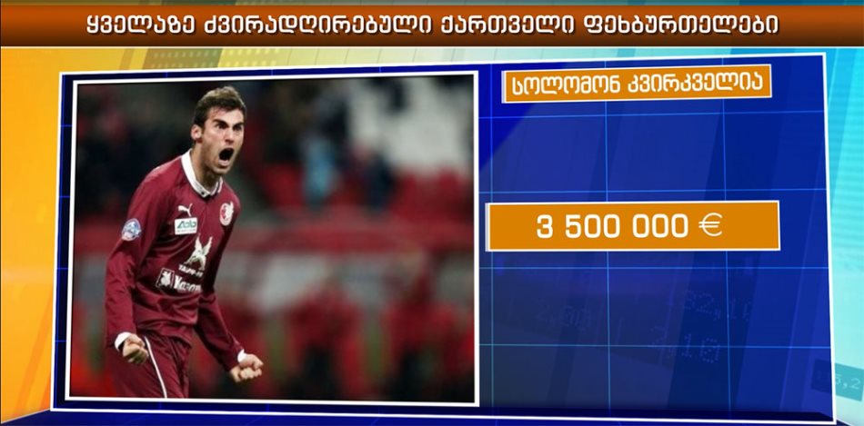 პირველ ადგილზე კი სოლომონ კვირკველიაა. საქართველოს ნაკრების 25 წლის მცველის სატრანსფერო ღირებულება 3,5 მილიონ ევროს შეადგენს. კვირკელიას სატრანსფერო ღირებულება 2016 წელს 5 მილიონ ევროს შეადგენდა.