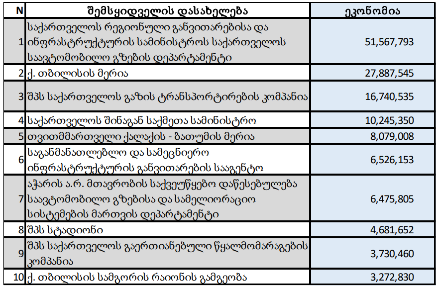 ჯამური სავარაუდო ღირებულების კუთხით, ყველაზე დიდი მაჩვენებლებით ტოპ-ათეულში პირველ ადგილზეა საქართველოს რეგიონული განვითარებისა და ინფრასტრუქტურის სამინისტროს საქართველოს საავტომობილო გზების დეპარტამენტი ჯამური სავარაუდო ღირებულებით 387 მილიონი ლარი, ხოლო მომდევნო ადგილებს ინაწილებენ თბილისის მერია და საქართველოს შინაგან საქმეთა სამინისტრო.
