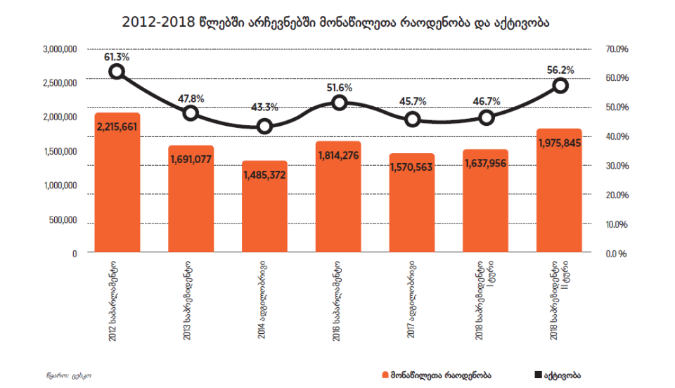 2012 წლიდან 2018 წლამდე პერიოდში ჩატარებულ 6 არჩევნებში ამომრჩეველთა საშუალო აქტივობა 50.4% იყო. 2012 და 2016 წლე ბის საპარლამენტო არჩევნებზე საშუალო აქტივობა 56.5% იყო, 2013 და 2018 წლების საპრეზიდენტო არჩევნების საშუალო აქტივობა 50.3% იყო, ხოლო 2014 და 2017 წლების ადგილობრივი თვითმმართველობის არჩევნების საშუალო აქტივობა – 44.5% .