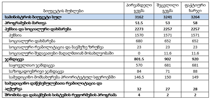 16 მილიონი ლარით შემცირდა პენსიის და მიზნობრივი სოციალური დახმარებების გეგმა. 6.5 მილიონი ლარით გაიზარდა პროგრამების მართვის ანუ ადმინისტრაციული (ბიუროკრატიული) ხარჯი.