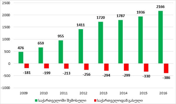 გრაფიკი: საქართველოს შემოსავალი და გასავალი საერთაშორისო ტურიზმიდან, მლნ დოლარი