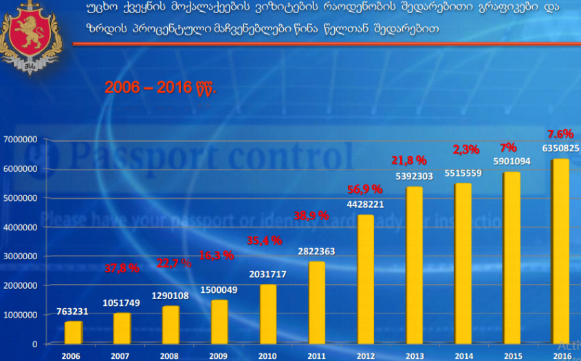 შინაგან საქმეთა სამინისტროს ინფორმაციით, 2016 წელს, 2015 წელთან შედარებით, საქართველოში შემოსულ ტურისტთა რაოდენობა 19%-ით გაიზარდა. 2015 წელს 2 281 971 ტურისტი შემოვიდა, ხოლო 2016 წელს 2 714 773.