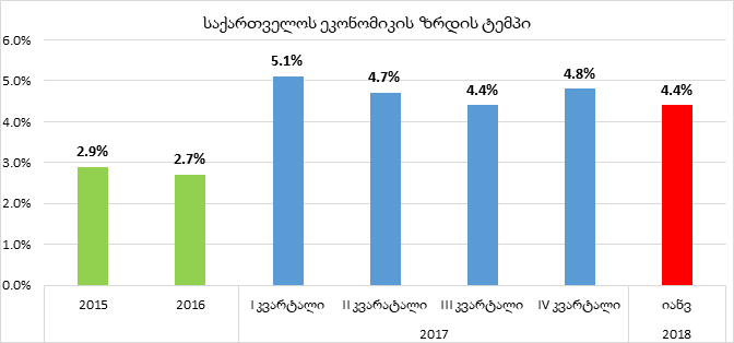 საქართველოს სტატისტიკის ეროვნული სამსახურის წინასწარი შეფასებით, მიმდინარე წლის იანვარში, წინა წლის იანვართან შედარებით, საქართველოს ეკონომიკა 4.4%-ით გაიზარდა. 2017 წლის იანვარში ზრდა 5.2% იყო.