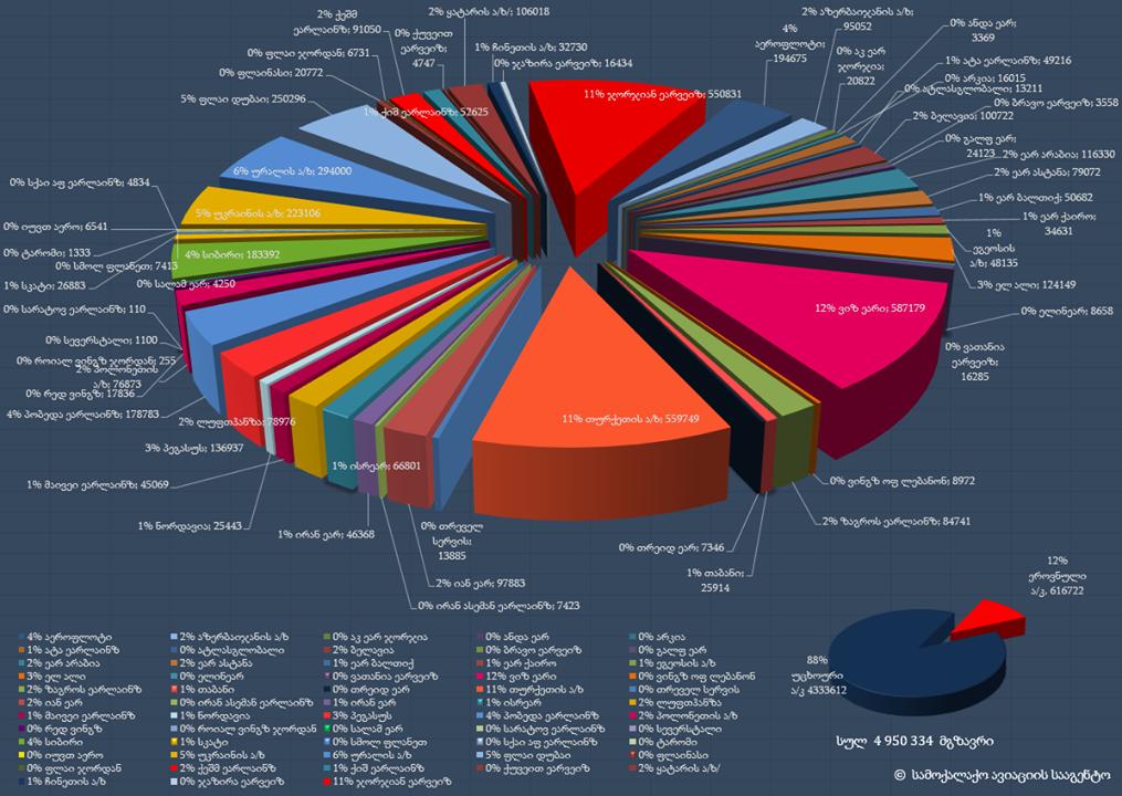 რაც შეეხება საქართველოს საავიაციო ბაზარზე მოქმედი ავიაკომპანიების პროცენტულ წილებს, 2018 წლის მონაცემებით, წამყვან პოზიციებზე სამი ავიაკომპანია იმყოფება, ესენია: “Wizz Air”, “Turkish Airlines” და ქართული ავიაკომპანია “Georgian Airways”-ი. სხვაობა სამი ავიაგადამზიდველის მიერ გადაყვანილი მგზავრების რაოდენობას შორის უმნიშვნელოა, ყველაზე მეტ მგზავრს კი WizzAir მოემსახურა – 587 179 გადაყვანილი მგზავრით უნგრული დაბალბიუჯეტური ავიაკომპანია ბაზრის ლიდერი გახდა.