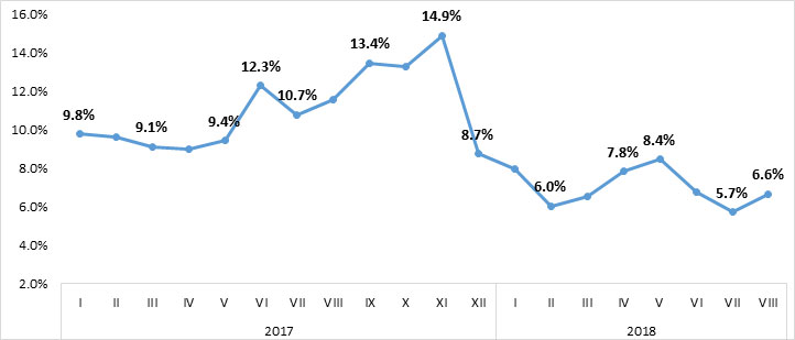 2018 წლის აგვისტოში წინა თვესთან შედარებით ფასები 2.1%-ით გაიზარდა გადამამუშავებელი მრეწველობის პროდუქციის ჯგუფზე, რამაც ინდექსის საერთო მაჩვენებელი 1.7% პუნქტით გაზარდა. კვების პროდუქტების, სასმელების წარმოება 1.1%-ით გაძვირდა, ძირითადი ლითონების და ლითონის მზა ნაწარმის წარმოება კი 7.8%-ით.