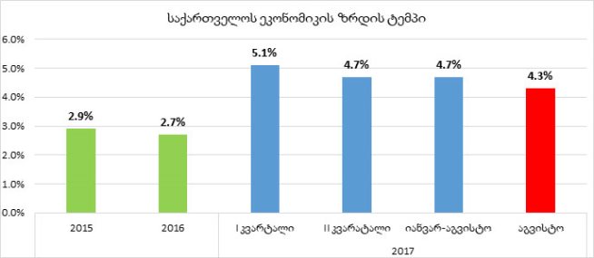 საქართველოს სტატისტიკის ეროვნული სამსახურის წინასწარი შეფასებით, მიმდინარე წლის აგვისტოში, წინა წლის აგვისტოსთან შედარებით, საქართველოს ეკონომიკა 4.3%-ით გაიზარდა. 2016 წლის აგვისტოში ზრდა 2.9% იყო. 2017 წლის პირველი რვა თვის (იანვარ-აგვისტოს) ეკონომიკურმა ზრდამ 4.7% შეადგინა.