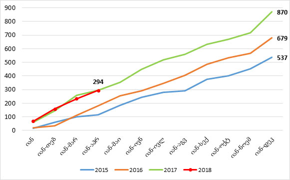 ოთხი თვის ჯამში, იანვარ-აპრილში ბანკების მოგება 294 მლნ ლარია, რაც 2017 წლის იანვარ-აპრილის მოგებაზე 1.2 მლნ ლარით (0.4%-ით) ნაკლებია.