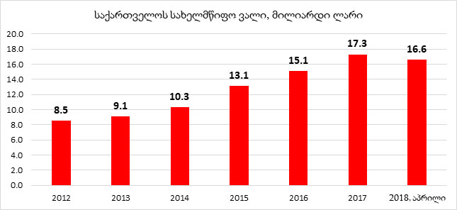 მიმდინარე წლის აპრილში საქართველოს სახელმწიფო ვალის მოცულობა 208 მლნ ლარით გაიზარდა და 16.6 მილიარდი ლარი შეადგინა. დოლარში გამოსახული საგარეო სახელმწიფო ვალი 54 მლნ დოლარით შემცირდა, მაგრამ ლარის კურსის გაუფასურების გამო, ლარში გამოსახული საგარეო სახელმწიფო ვალი 118 მლნ ლარით გაიზარდა. აპრილში საშინაო სახელმწიფო ვალი 90 მლნ ლარით გაიზარდა.