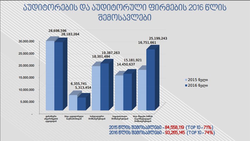 გასულ წელს აუდიტორებისა და აუდიტორული ფირმების შემოსავლებმა 93 მილიონს გადააჭარბა და 93 265 145 ლარი შეადგინა.