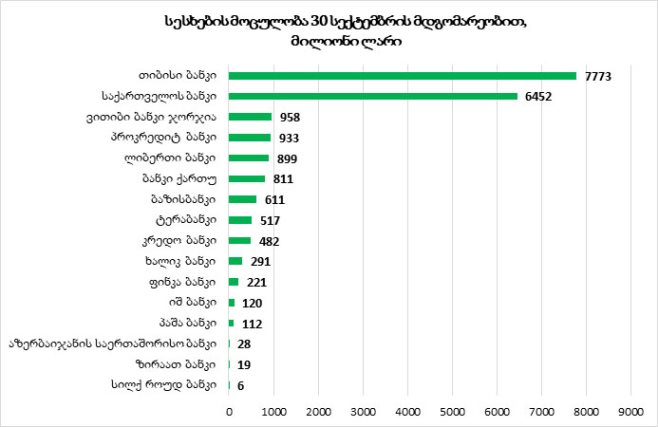 მეორე ადგილზე „საქართველოს ბანკია“ 6 452 მლნ ლარით, რაც 21.4%-ით მეტია წინა წლის 30 სექტემბრის მდგომარეობით გაცემული სესხების მოცულობაზე. მესამეზე „ვითიბი ბანკი ჯორჯიაა“ 958 მლნ ლარით.