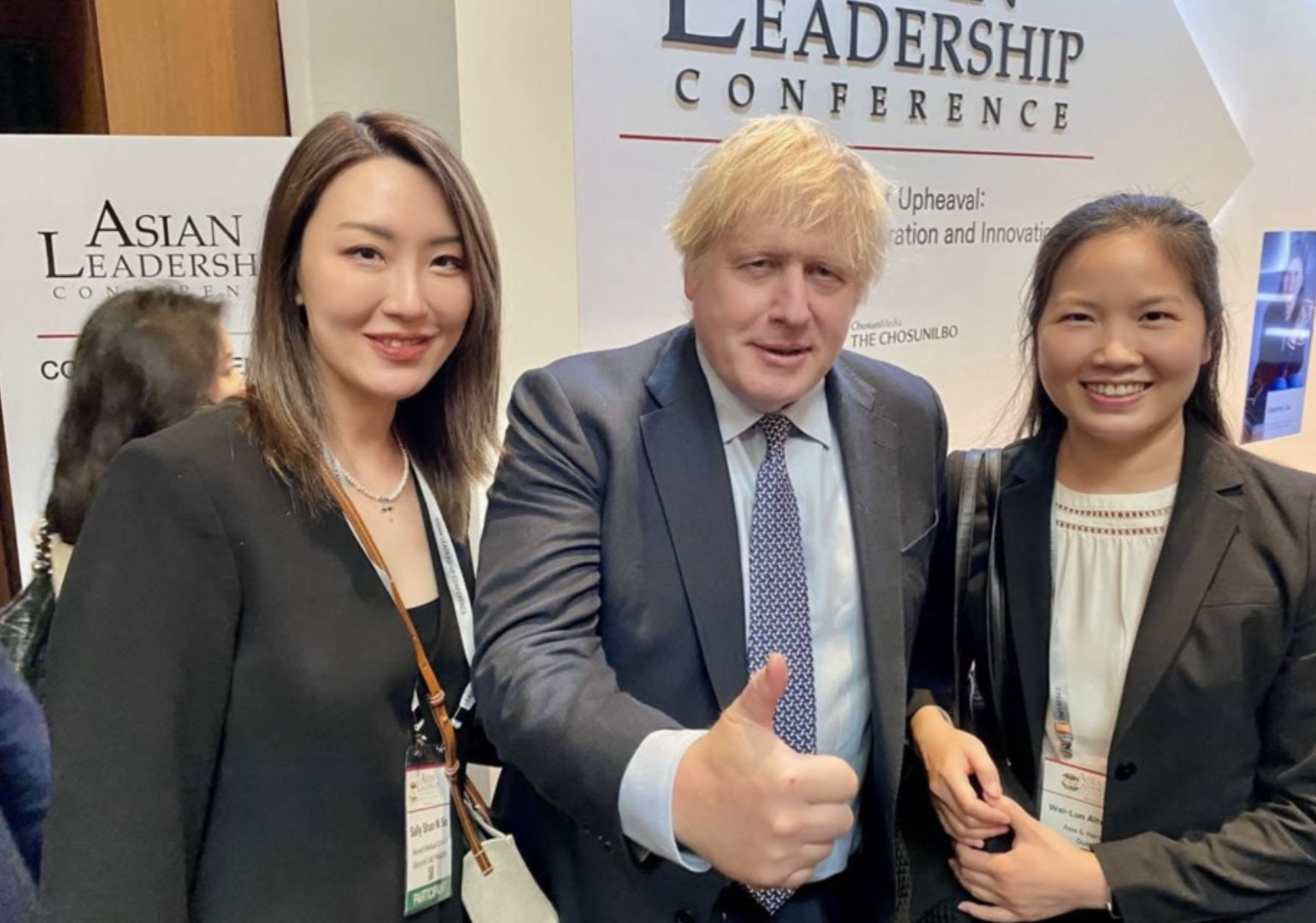 Photo: GenomiiAI Founder Sally So (left), former UK Prime Minister Boris Johnson (center), and Genomii’s Chief Advisor Grace (right)