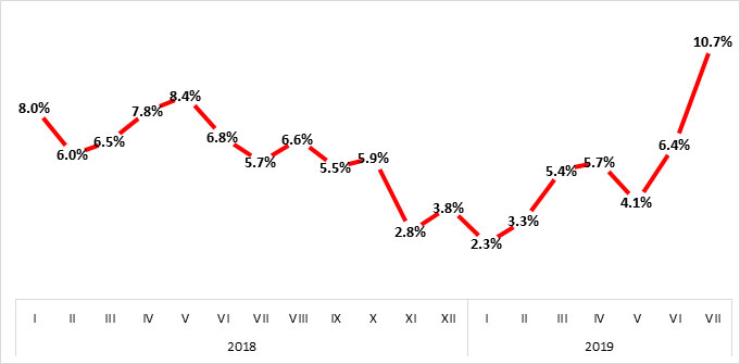 2019 წლის ივლისში წინა თვესთან შედარებით ფასები 2%-ით გაიზარდა გადამამუშავებელი მრეწველობის პროდუქციის ჯგუფზე, რაც მთლიანი ინდექსის კლებაზე 1.7% პუნქტით აისახა. ჯგუფში შემავალი პროდუქტებიდან აღსანიშნავია ფასების ზრდა ძირითად ლითონებსა და ლითონის მზა ნაწარმზე – 4.3%-ით. 1.2%-ით გაძვირდა კვების პროდუქტების და სასმელების წარმოება, 9%-ით ელექტროენერგიის, წყლის და აირის წარმოება და განაწილება.