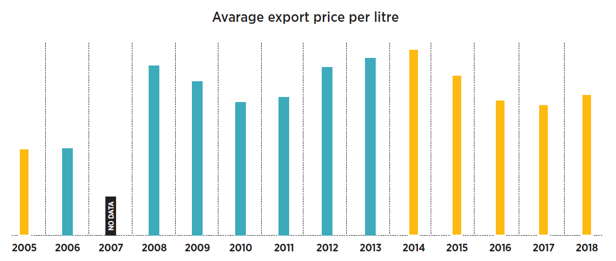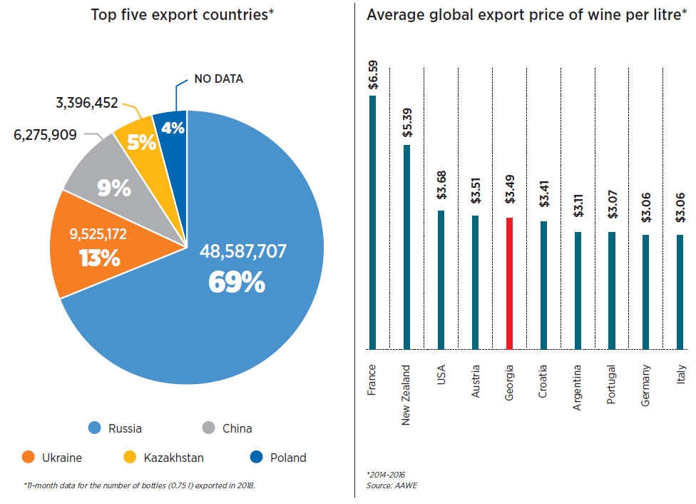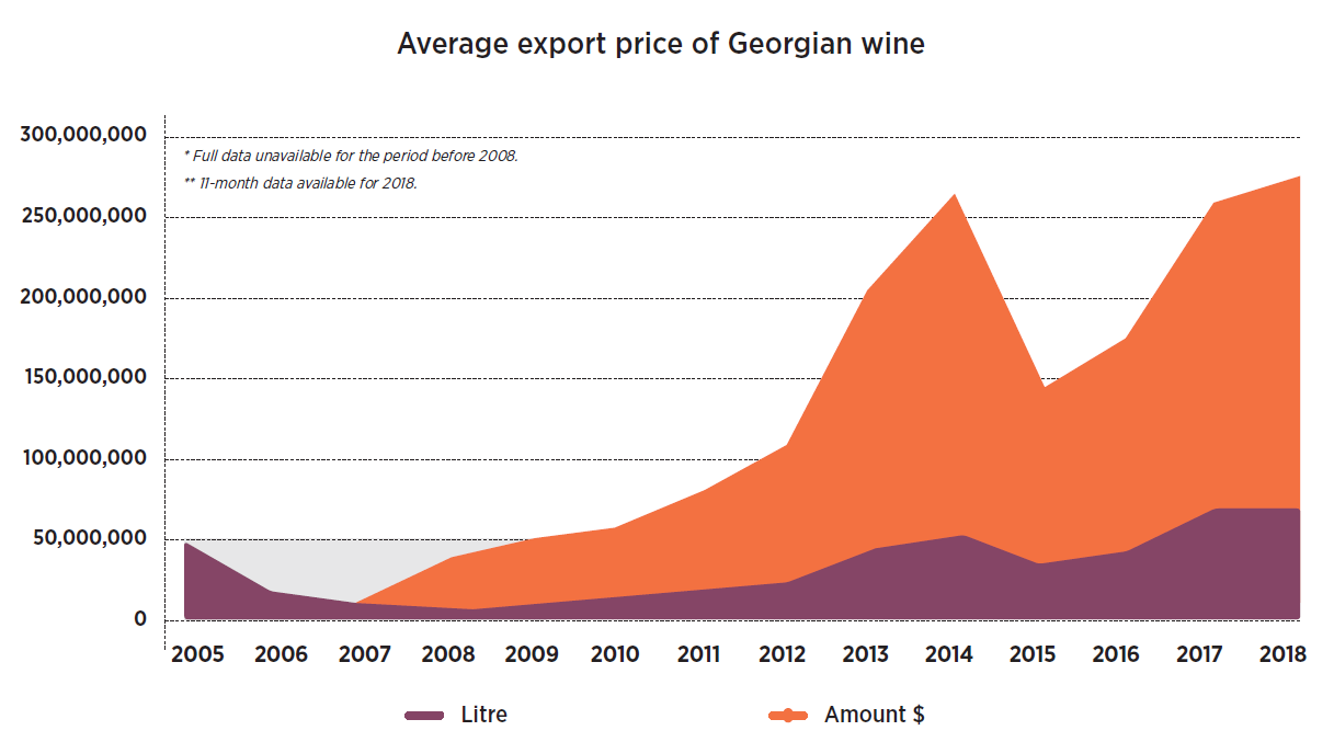 According to the American Association of Wine Economists (AAWE), in 2014-2016 Georgia was ranked 5th in the world with regard to the average price per litre of its wine exports. France topped the rankings published by the prestigious American organization. The average price ofexportedwine varies by export market. The Georgian National Wine Agency figures differ slightly from the AAWE data. 2017 was a record year for Georgian wine exports in terms of quantity. However, export revenues reached their peak in 2014 – a year after the lifting of the Russian embargo. Up until the start of the embargo in 2006, Russia was the only major export market for Georgian wine. Following the embargo, Georgian manufacturers began diversifying its export markets. The Russian embargo also led to a significant increase in the quality of the Georgian wine, as the average export price soon almost doubled. Although the number of export markets grew and surpassed the 55 mark, Russia remains the largest importer of Georgian wine (61% of the total export for the first 11 months of 2018), as a result of which, the aforementioned growth has not been accompanied by an increase in the average price of exports.