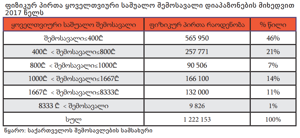 საქართველოს შემოსავლების სამსახურის ელექტრონულ საინფორმაციო სისტემაზე დაყრდნობით, 2017 წელს, სულ 1 222 153 ფიზიკური პირის შემოსავალი დეკლარირდა. PMC კვლევის მიხედვით, ფიზიკური პირების 46%-ის (565 950 ადამიანი) ყოველთვიურმა შემოსავალმა საშუალოდ 400 ლარზე ნაკლები, ხოლო 1%-ის (9 826 ადამიანი) შემოსავალმა კი – 8 333 ლარზე მეტი შეადგინა. 2017 წელს, თვეში საშუალოდ 1000 ლარზე ნაკლები შემოსავალი ფიზიკურ პირთა 74%-ს (914 227 ადამიანი), 1000 ლარზე მეტი კი 26%-ს (307 926 ადამიანი) დაუფიქსირდა.