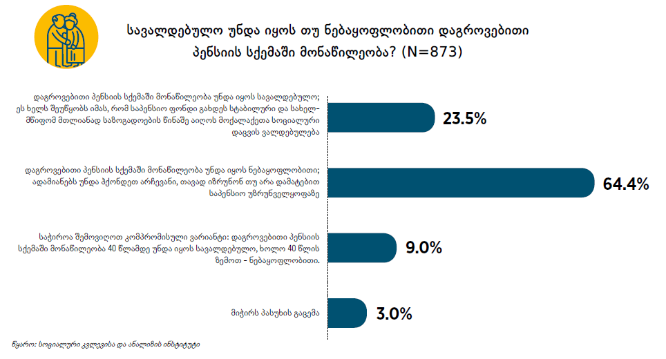 “ქართულმა ოცნებამ” საპენსიო სისტემის ე.წ. მეორე სვეტი ძალდატანების პრინციპით შემოიღო. მასში გაწევრიანება 40 წლამდე ასაკის დასაქმებულისთვის სავალდებულოა. არადა, “საპენსიო სისტემის რეფორმის მიმართ მოსახლეობის დამოკიდებულების” კვლევაში ნათლად ჩანს: მოქალაქეების 65% დაგროვებით საპენსიო სქემაში ნებაყოფლობითი და არა სავალდებულო, ძალდატანებითი მონაწილეობის მომხრეა.