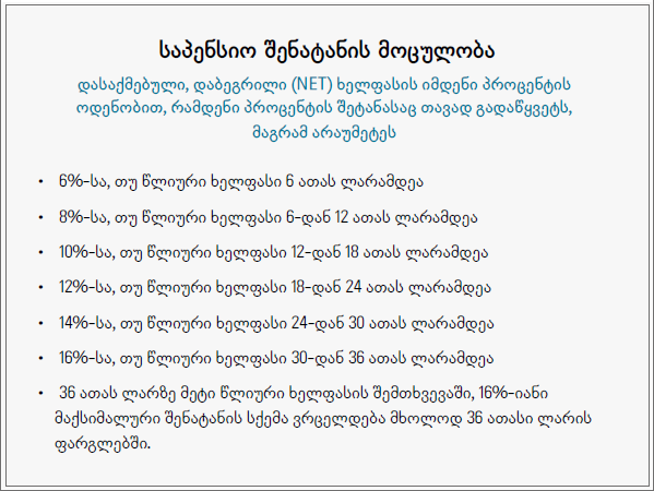 ასეთი დამაიმედებელი რიცხვები “ევროპული საქართველოს” სქემით იმიტომ მიიღება (ეკონომიკური ზრდის, ინფლაციის, საპროცენტო სარგებლის და სხვა დაშვებები საკმაოდ კონსერვატულია), რომ საპენსიო დანაზოგი არა დარიცხული ხელფასის 6%-ია, როგორც “ქართული ოცნების” სქემაში, არამედ გაცილებით მეტი: მაგალითად, 500-ლარიან დარიცხულ ხელფასზე – 24.8%, ხოლო 1,500-ლარიანზე – 22%.