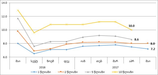 მიმდინარე წლის თებერვლიდან სახელმწიფო ფასიან ქაღალდებზე საპროცენტო განაკვეთების კლება დაიწყო. თუმცა, გასული წლის სექტემბერთან შედარებით განაკვეთები გაზრდილია.