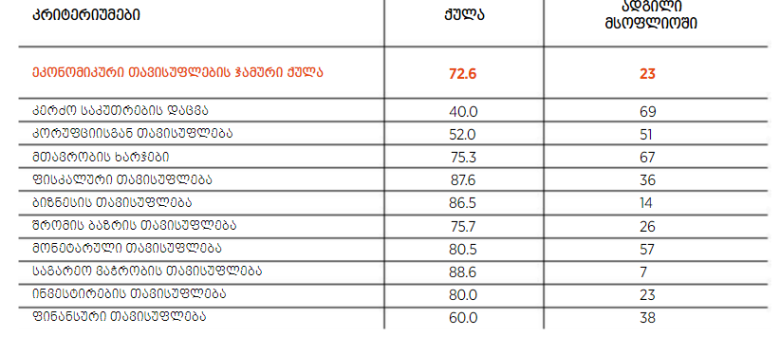 საქართველოს ყველაზე დაბალი ქულები და, შესაბამისად, ყველაზე ცუდი პოზიცია კანონის უზენაესობის კრიტერიუმებში აქვს. კანონის უზენაესობა მოიცავს კერძო საკუთრების დაცვისა და კორუფციისგან თავისუფლების კრიტერიუმებს.