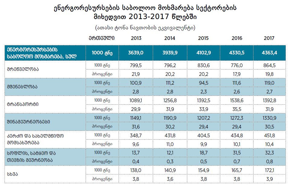 საქართველოს სტატისტიკის ეროვნულმა სამსახურმა დეკემბრის მიწურულს ენერგორესურსების მოხმარების შესახებ ანგარიში გამოაქვეყნა, სადაც 2017 წლის შედეგები და მონაცემებია ასახული.