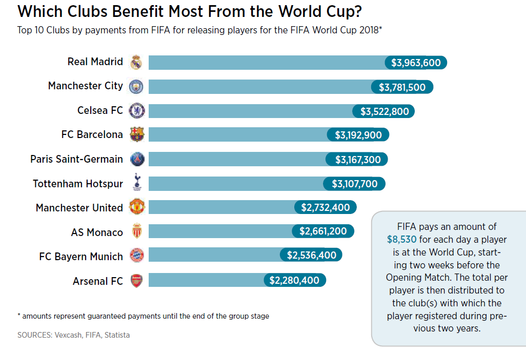 But what about the clubs who employ the players competing at the tournament? After all, they are the ones who pay the players’ lofty salaries and the ones who pay the price if a player suffers an injury at the World Cup. They are paid $8,530 for each day a player is at the World Cup, starting two weeks before the Opening Match and ending one day after the respective nation’s exit from the tournament.