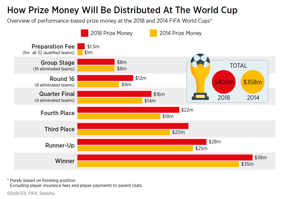 WHILE THE 32 TEAMS INVOLVED IN THE FIFA WORLD CUP will be aiming to go as far as possible and achieve success on the pitch, they will also be battling for a sizeable pot of prize money. Late last year, FIFA announced the amount of prize money available for the tournament in Russia and it’s at record levels once again. Excluding the Club Benefit and Protection Programmes, prize money this year stands at $400 million, an increase on 2014’s $358 million.The following infographic provides an overview of how the performance-based prize money will be distributed. When Germany won the trophy in 2014, it was awarded $35 million. This year, the eventual winner in Russia will receive even more, $38 million. The runner-up will get $28 million while third place will receive $24 million.