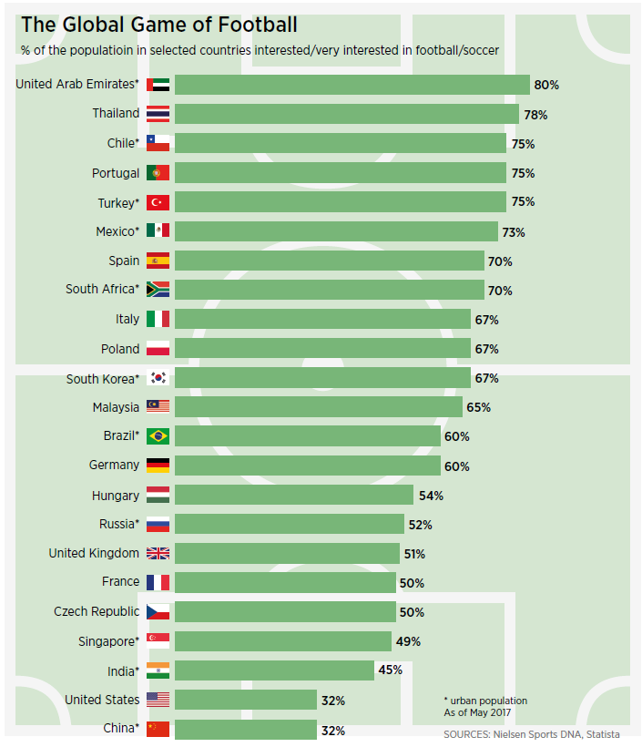 OFTEN REFERRED TO AS THE GLOBAL GAME, football (i.e. soccer) is played, followed and talked about in almost every corner of planet earth. The sport’s biggest event, the quadrennial FIFA World Cup, is one of the biggest sporting events in the world, only matched by the Olympics in terms of its near universal reach. According to FIFA, 3.2 billion people watch at least one minute of World Cup coverage on TV in 2014, a number that will likely be matched by this year’s tournament in Russia.