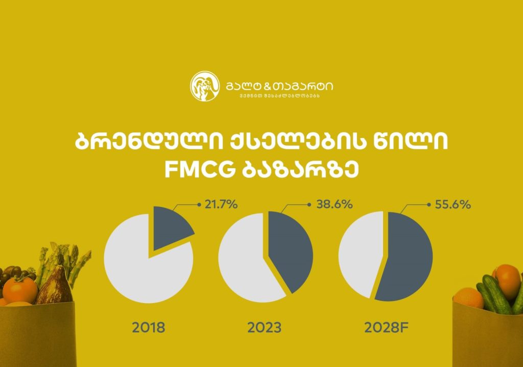 გალტ & თაგარტის კვლევის თანახმად, FMCG ბაზრის ზომა 2018-23 წლებში გაორმაგდა და ჯამურმა FMCG დანახარჯებმა 2023 წელს. 21.0 მლრდ ლარი შეადგინა. სწრაფი ზრდის მთავარი კონტრიბუტორი კი სწორედ ბრენდული ქსელების რეგიონული ექსპანსიაა. მაგალითისთვის, ბრენდული ქსელების შემოსავლები საშუალოდ, წლიურად 28.1%-ით იზრდებოდა 2018-23 წლებში, ხოლო სხვა ფორმატების შემოსავლები 8.8%-ით.