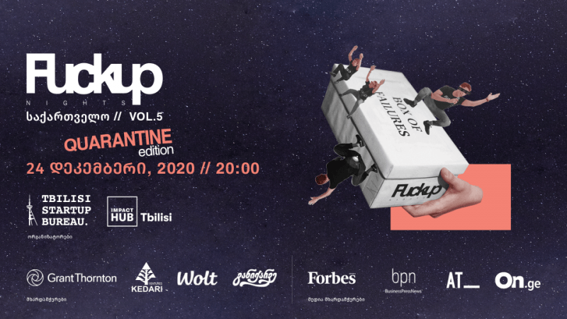 Fuckup Nights საქართველო კარანტინში vol. 5, 24 დეკემბერს, თბილისის დროით 20:00-საათზე სეზონის ბოლო, კიდევ ერთ საინტერესო საღამოს გვპირდება წარუმატებელი 2020 წლის გასაცილებლად, იმით, რაც მათ ყველაზე კარგად გამოსდით – მარცხის ისტორიების გაზიარებითა და გართობით. Tbilisi Startup Bureau-სა და Impact Hub Tbilisi-ის მასპინძლობით ღონისძიება უკვე ოცდამეშვიდედ ჩატარდება, მიმდინარე მოვლენების გათვალისწინებით, რაღა თქმა უნდა, ისევ და ისევ ონლაინ რეჟიმში.