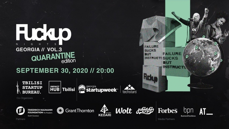30 სექტემბერს, თბილისის დროით 8 საათზე, Fuckup Nights Tbilisi კიდევ ერთ საინტერესო საღამოს გვპირდება. თბილისის სტარტაპ ბიურო და იმფაქთ ჰაბ თბილისი Fuckup Nights-ს საქართველოში უკვე ოცდამეოთხედ მასპინძლობენ. ამჯერად ღონისძიება ტარდება Tachstars-ის სტარტაპ კვირეულის ფარგლებში. უსაფრთხოების დაცვის მიზნით ღონისძიება კარანტინის ფარგლებში, რაღა თქმა უნდა, ისევ ონლაინ რეჟიმში გაიმართება, რაც ნიშნავს, რომ საინტერესო მარცხის ისტორიების მოსმენას კვლავ საკუთარი სახლის კომფორტიდან შევძლებთ.