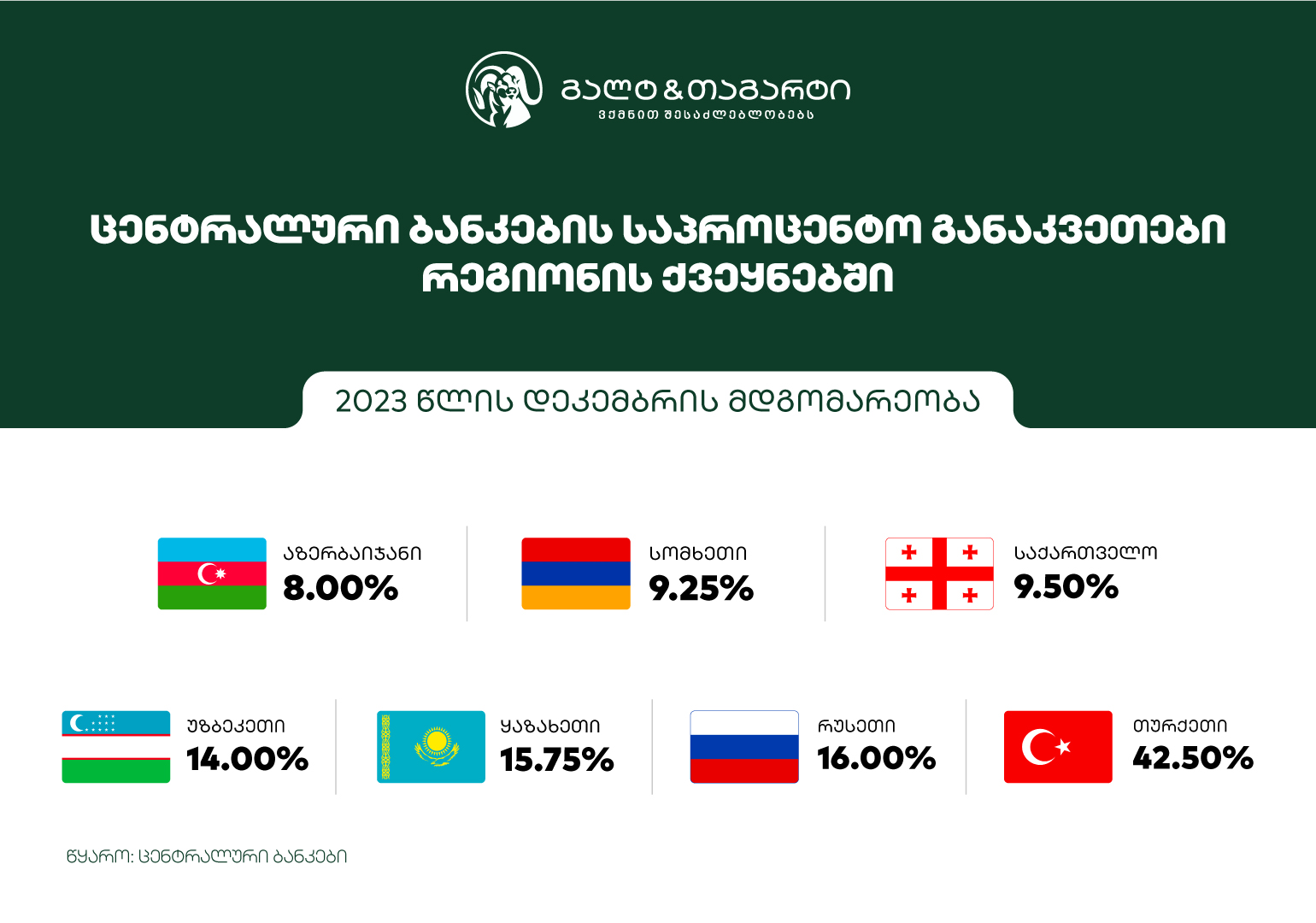 გალტ & თაგარტის პროგნოზით, საქართველოში მონეტარული პოლიტიკის განაკვეთის შემცირება გაგრძელდება და 2024 წლის ბოლომდე 100 საბაზისო პუნქტით, 8.5%-მდე შემცირებაა მოსალოდნელი. დიდი ალბათობით, იგივე ზომის, 100 საბაზისო პუნქტით შემცირებას შესაძლოა ადგილი ჰქონდეს სომხეთსა და აზერბაიჯანშიც. S