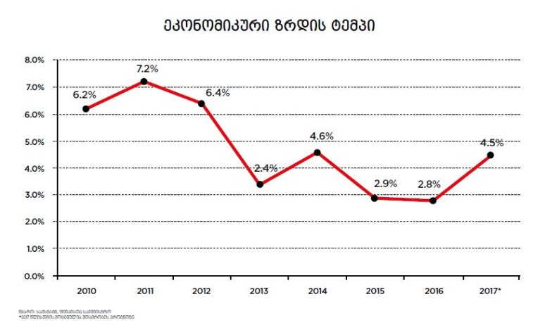 2017 წლის ნოემბრამდე მთავრობა პროგნოზირებდა, რომ წლიური ეკონომიკური ზრდა 4% იქნებოდა, თუმცა საბოლოოდ საქართველოს ეკონომიკური ზრდის პროგნოზი 4.5%-მდე გაიზარდა და, მაღალი ალბათობით, ფაქტობრივი მაჩვენებელი (რომელიც მარტის ბოლოს გამოქვეყნდება) 4.5%-ზე მეტი იქნება.
