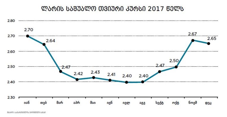 წინა წლების მსგავსად, 2017 წელსაც, არამარტო ეკონომიკაში, ზოგადად ქვეყნის ცხოვრებაში, ერთ-ერთი ყველაზე აქტუალური საკითხი ლარის დოლარის მიმართ გაცვლითი კურსი იყო. 2017 წლის დასაწყისში ლარის კურსი დოლარის მიმართ 2.76 იყო. 5 იანვრიდან გამყარება დაიწყო და 17 აპრილს 2.37 შეადგინა. აგვისტოს ბოლომდე კურსი სტაბილურობას ინარჩუნებდა 2.40-თან ახლოს. აგვისტოს ბოლოდან ლარმა ისევ გაუფასურება დაიწყო და 28 ნოემბერს 2.72-ს მიაღწია, მომდევნო პერიოდში კი გამყარდა.