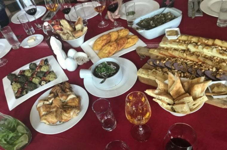It’s difficult to pronounce, (think hatch-a-pooree) but then again your mouth is too busy enjoying the heady mix of local cheeses which fill – both outside and inside – the soft dough that is baked to perfection. Such is the volume of cheese, this is more of a “rip” than a slice, as molten goodness oozes and spills everywhere. Romantic dining it isn’t.