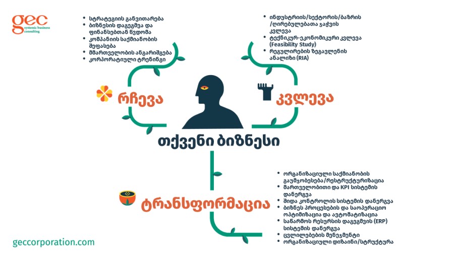 ტრანსფორმაციის ერთ-ერთი მიმართულება, არის კომპანიების დახმარება რესტრუქტურიზაციასა და ცვლილებების განხორციელებასა და მართვაში. წელიწადში რამდენიმე მსგავს პროექტს ვახორციელებთ, რომლებიც შედარებით ხანგრძლივი და კომპლექსური და მომხმარებლებთან წინასწარ განსაზღვრულ შედეგებზეა ორიენტირებული. გამოცდილებით, რესტრუქტურიზაციის მიმართულებით GEC-სთან თანამშრომლობის შემდეგ მომხმარებლებს ძალიან კარგი შედეგები აქვთ, რაც გამოიხატება გაყიდვებში დაახლოებით 20-25%-იანი ზრდით ან ხარჯების 10-15% შემცირებით. მიუხედავად იმისა რომ პროცესი საკმაოდ რთულია, ჩვენი მიდგომები დამუშავებული გვაქვს და შეიძლება ითქვას ამ მხრივ, წარუმატებელი პროექტი არ გვქონია.