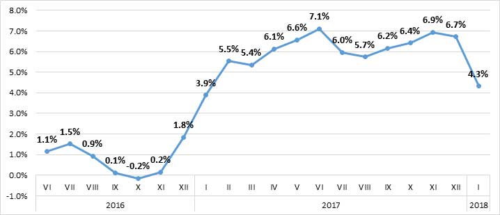 საქართველოს სტატისტიკის ეროვნული სამსახურის ინფორმაციით, იანვარში სამომხმარებლო საქონლისა და მომსახურების ფასების დონე 0.6%-ით გაიზარდა, წლიურმა ინფლაციამ (12 თვის) კი 4.3% შეადგინა, რაც ნიშნავს, რომ ბოლო ერთ წელიწადში სამომხმარებლო პროდუქცია 4.3%-ით გაძვირდა. 2010 წელთან შედარებით ფასები 28%-ით არის გაზრდილი.