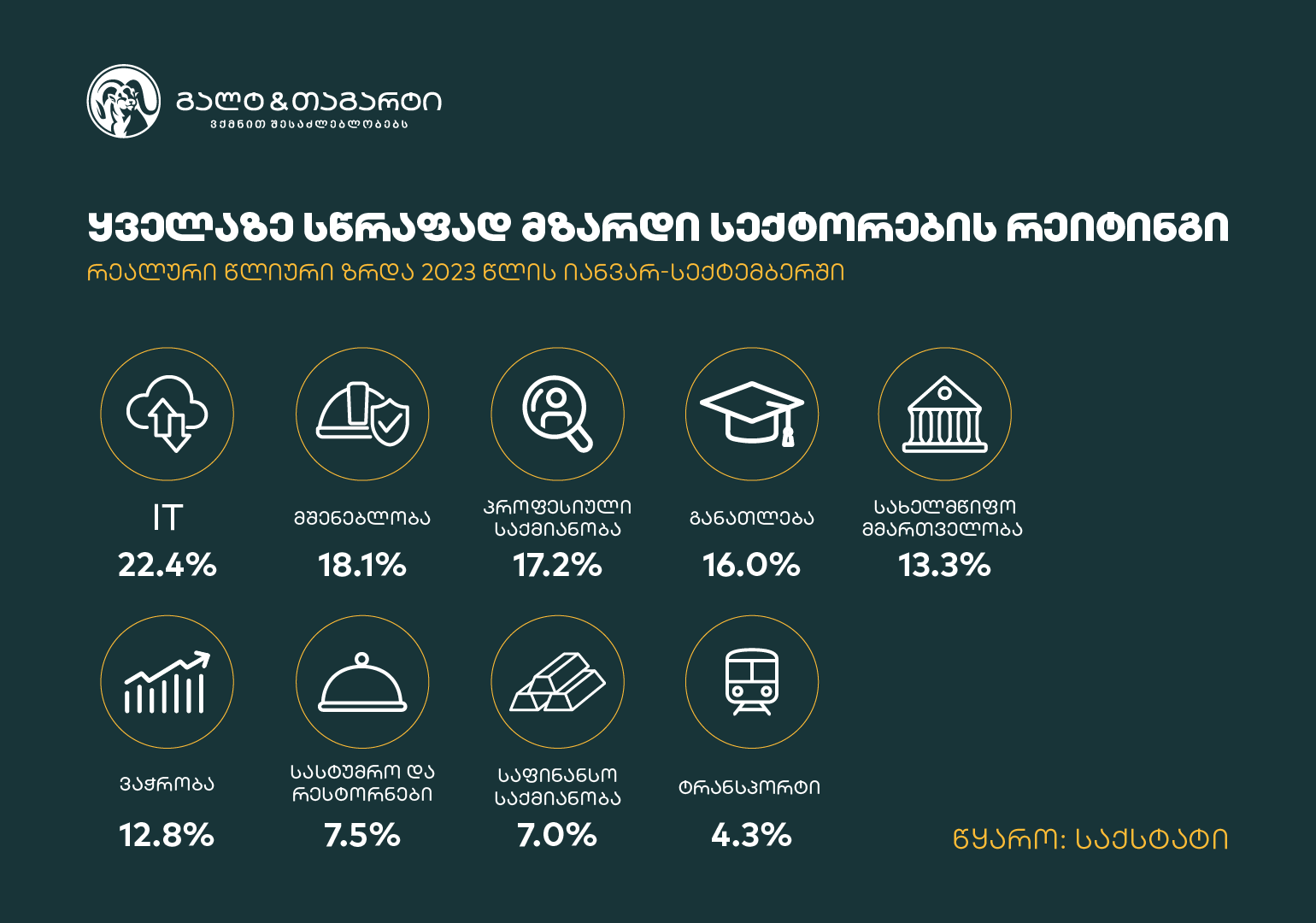 აღსანიშნავია, რომ 2022 წლიდან ეკონომიკის სტრუქტურაში საინტერესო ცვლილება დაფიქსირდა – IT დარგმა გადაასწრო საფინანსო სექტორს და მე-8 ადგილი დაიკავა საქართველოს ეკონომიკის სტრუქტურაში. ეს ტენდენცია მიმდინარე წელსაც გრძელდება. დარგობრივ ჭრილში, ასევე აღსანიშნავია ტრანსპორტის და დასაწყობების დარგის მაღალი აქტივობა, რომლის კონტრიბუციაც ეკონომიკურ ზრდაში გაორმაგებულია 2021 წლიდან.