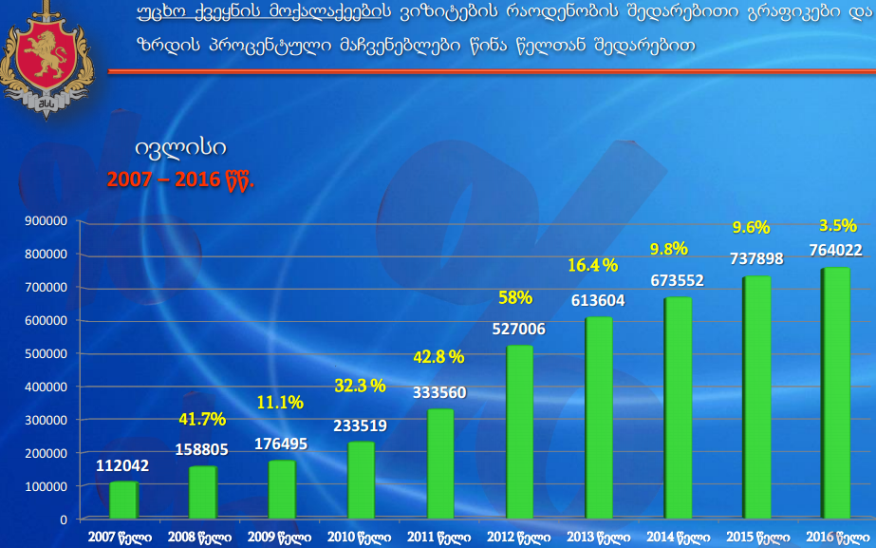ვიზიტორების რაოდენობა, რომელიც ტურისტებთან ერთად, ტრანზიტს და სხვა კატეგორიებს მოიცავს, 2015 წლის ივლისთან შედარებით 3.5%-ით გაიზარდა. 2015 წლის ივლისში 737 898 ვიზიტორი შემოვიდა, ხოლო 2016 წლის ივლისში კი 764 022. იანვარ-ივლისში ვიზიტორთა რაოდენობის ზრდამ 11% შეადგინდა.