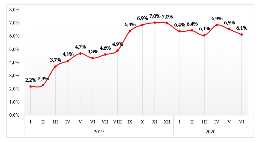 საქართველოს სტატისტიკის ეროვნული სამსახურის ინფორმაციით, ივნისში სამომხმარებლო საქონლისა და მომსახურების ფასების დონე 1.4%-ით შემცირდა, წლიურმა ინფლაციამ (12 თვის) კი 6.1% შეადგინა, რაც ნიშნავს, რომ ბოლო ერთ წელიწადში სამომხმარებლო პროდუქცია 6.1%-ით გაძვირდა.