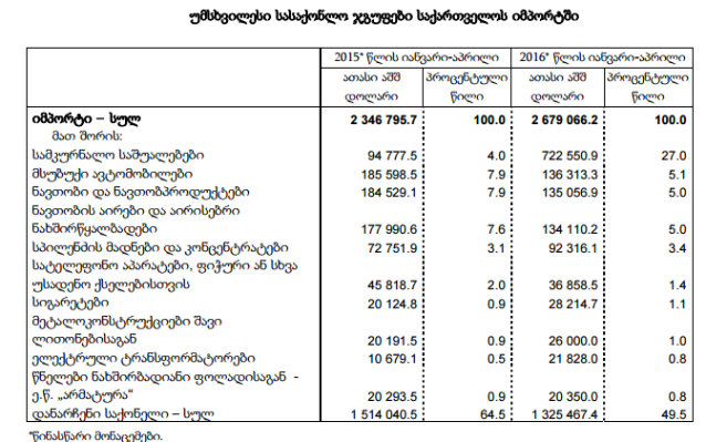 საქართველოს სტატისტიკის ეროვნული სამსახურის მონაცემებით, მიმდინარე წლის აპრილში, წინა წლის აპრილთან შედარებით, საქართველოში იმპორტი 78%-ით გაიზარდა და 987 მილიონი დოლარი შეადგინა. იანვარ-აპრილში კი იმპორტმა ექსპორტს 2 მილიარდი დოლარით გადააჭარბა. თუმცა, მიმდინარე წლის იმპორტში მნიშვნელოვანი წილი უჭირავს „ც ჰეპატიტის“ სამკურნალო საშუალებების ღირებულებას, რაშიც რეალურად საქართველო ფულს არ იხდის და ამერიკული კომპანიისგან გრანტად მოგვეწოდება. ეს ნიშნავს, რომ იმპორტის შედეგად საქართველოდან გაციელბით ნაკლები უცხოური ვალუტა გაედინება, ვიდრე იმპორტის ოფიციალური ჯამობრივი მონაცემია.