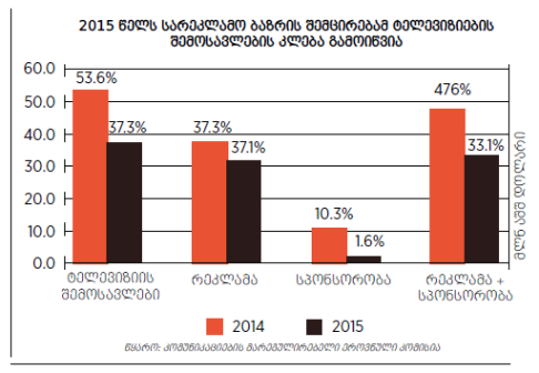 ეკონომიკური ზრდის ტემპის შენელებამ და ლარის კურსის ცვლილებამ ტელევიზიის შემოსავლებზეც იქონია გავლენა. 2015 წელს ტელევიზიების შემოსავლებმა 84.6 მილიონი ლარი შეადგინა, რაც 10 მილიონი ლარით ნაკლებია წინა წლის ანალოგიურ მონაცემზე. ტელევიზიების შემოსავლების შემცირება ძირითადად სარეკლამო შემოსავლების კლებამ გამოიწვია. კერძოდ, 2015 წელს ტელევიზიებმა ჯამში სარეკლამო შემოსავლების სახით 75.4 მილიონი ლარი მიიღეს, რაც 10%-ით ნაკლებია წინა წლის მაჩვენებელზე. სარეკლამო შემოსავლები ტელეკომპანიების დაფინანსების ძირითად წყაროს წარმოადგენს, 2015 წელს ტელემაუწყებლების შემოსავლების 84.6% რეკლამის განთავსებიდან იყო მიღებული. შესაბამისად, სარეკლამო შემოსავლების შემცირება, თავისთავად ცხადია, უარყოფითად მოქმედებს მედიის ფინანსურ მდგომარეობაზე და მის დამოუკიდებლობას უქმნის საფრთხეს.