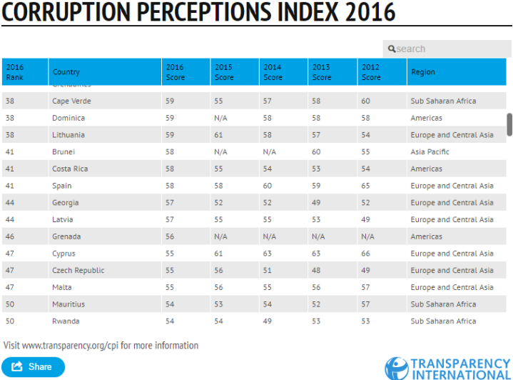 გერმანული არასამთავრობო ორგანიზაცია “საერთაშორისო გამჭვირვალობა” ყოველწლიურად აქვეყნებს ქვეყნების კორუფციის დონის რეიტინგს. რეიტინგი ეფუძნება კორუფციის აღქმის ინდექსს (Corruption Perceptions Index). ინდექსში კორუფცია განმარტებულია, როგორც საჯარო (პოლიტიკური) ძალაუფლების პირადი კეთილდღეობისთვის გამოყენება. კვლევის შედეგები მოსახლეობის და ექსპერტების გამოკითხვას ემყარება. კვლევა მსოფლიოს 176 ქვეყანას მოიცავს. ინდექსის მაქსიმალური ქულაა 100 და ნიშნავს კორუფციისგან სრულად თავისუფალ ქვეყანას. 100 ქულა არც ერთ ქვეყანას არ აქვს, თუმცა 90 ქულით დანიაა პირველ ადგილზე.