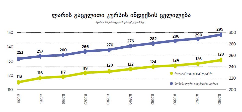 ლარის ნომინალური და რეალური ეფექტური კურსი გასული წლის ნოემბრიდან მიმდინარე წლის აგვისტოს ჩათვლით განუხრელად მყარდებოდა. ეს ნიშნავს, რომ იმ პერიოდებშიც კი, როდესაც ლარი დოლარის მიმართ უფასურდებოდა, საქართველოს სავაჭრო-პარტნიორი ქვეყნების ვალუტებთან (განსაკუთრებით თურქულ ლირასა და რუსულ რუბლთან) მიმართებით მყარდებოდა. ამას შედეგად ჩვენი სავაჭრო პირობების გაუარესება მოჰყვა, რაც სავაჭრო ბალანსზეც აისახა. 2017 წლის იანვარ-აგვისტოსთან შედარებით, 2018 წლის იანვარ-აგვისტოში სავაჭრო დეფიციტი 578 მლნ დოლარით გაიზარდა.