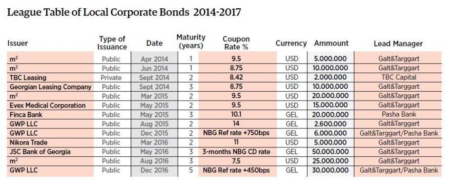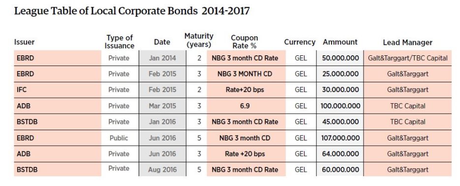 There was a notable change in the government’s and NBG’s attitude towards the bond market starting in 2014.To spur the development of the IFI bond market, NBG established a list of “acceptable” IFI issuers (mainly AAA-rated institutions) who could issue bonds in GEL, simplify IFI bond issuance procedures. They also made these bonds eligible for repo transactions. Largely as a result of these measures, since 2014, ADB, EBRD, IFC and the Black Sea Development Bank have issued ₾8-denominated bonds for a total of around ₾480million. Government support was also reflected in the corporate bond market. From January 2014 through May 2017, there have been13 successful offerings of corporate bonds, totaling approximately $140million, of which, five placements were in the national currency.