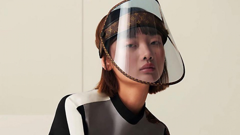 Louis Vuitton’s face shields, part of the company’s 2021 Cruise collection, will include an elastic monogrammed strap attached to a shield with gold studs engraved with the LV logo.