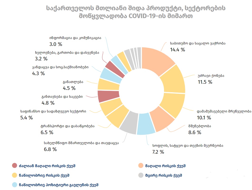 “სასტუმრო & საკვები და ხელოვნება-გართობის საქმიანობები ძალიან მაღალი რისკის ქვეშ არიან, თუმცა ჯამურად მათი წილი მშპ-ში დაახლოებით 10%-ია. უფრო დიდი წილი აქვს ეკონომიკაში საბითუმო & საცალო ვაჭრობას (14%) და მშენებლობას (8.6%). ეს სექტორებიც მაღალი რისკის ზონაში ხვდებიან“, – წერია მიმოხილვაში.