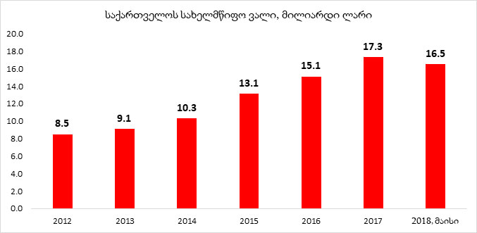 მიმდინარე წლის მაისში საქართველოს სახელმწიფო ვალის მოცულობა 63 მლნ ლარით შემცირდა და 16.5 მილიარდი ლარი შეადგინა. დოლარში გამოსახული საგარეო სახელმწიფო ვალი 75 მლნ დოლარით შემცირდა, ლარში გამოსახული კი 133 მლნ ლარით. მაისში საშინაო სახელმწიფო ვალი 70 მლნ ლარით გაიზარდა.