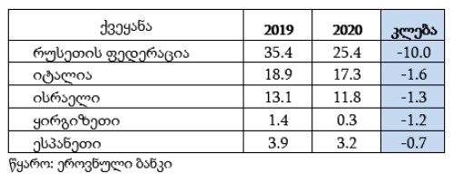 ცხრილი: ქვეყნები, საიდანაც მარტში ფულადი გზავნილები ყველაზე მეტად შემცირდა, მლნ დოლარი: