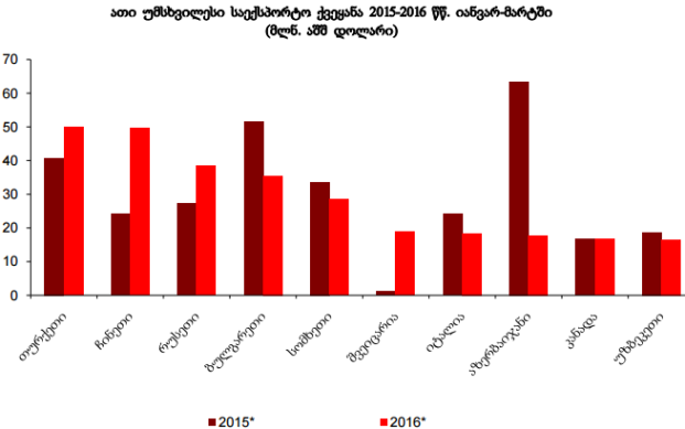 სტატისტიკის ეროვნული სამსახურის ინფორმაციით, 2016 წლის მარტში, წინა წლის მარტთან შედარებით, საქართველოს ექსპორტი ევროკავშირის ქვეყნებში 48%-ით (29 მილიონი დოლარით) შემცირდა და 33.3 მილიონი დოლარი შეადგინა. დსთ-ს ქვეყნებში ექსპორტი 15.6% (10 მილიონი დოლარით) შემცირდა. თუმცა, აღსანიშნავია ის, რომ რუსეთში ექსპორტი 35%-ით (4 მილიონი დოლარით) გაიზარდა.