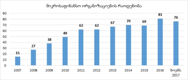 საქართველოს ეროვნულო ბანკის მონაცემებით, 2017 წლის ნოემბრის ბოლოს საქართველოში 76 მიკროსაფინანსო ორგანიზაცია და 1 120 ვალუტის გადამცვლელი პუნქტი იყო. 2016 წლის შემდეგ მიკროსაფინანსოების რიცხვი 5 ერთეულით, ხოლო ვალუტის გადამცვლელი პუნქტების – 80 ერთეულით შემცირდა. მიკროსაფინანსო ორგანიზაციების რიცხვი განსაკუთრებით სწრაფად იზრდებოდა 2007-2011 წლებში. 2011 წლის შემდეგ მხოლოდ 14 ერთეულით გაიზარდა.
